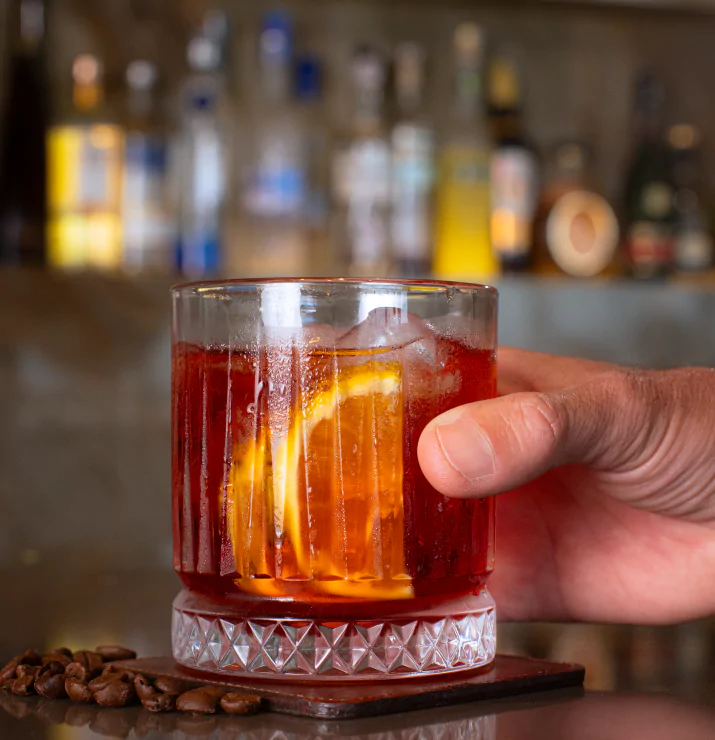 Coquetéis exclusivos harmonizados com petiscos, como Negroni com café + Mini Tábua de Queijos ou Gin com infusão de frutas + Carpaccio de Salmão Gravlax.