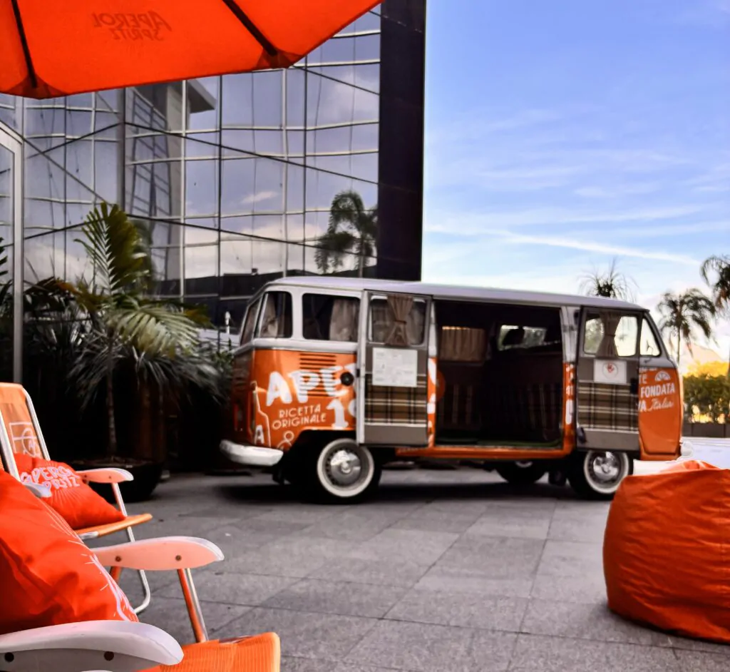 Churrasco no estilo food truck, com Kombi da Aperol e bebidas variadas disponíveis para curtir um fim de tarde no nosso espaço ao ar livre no térreo.