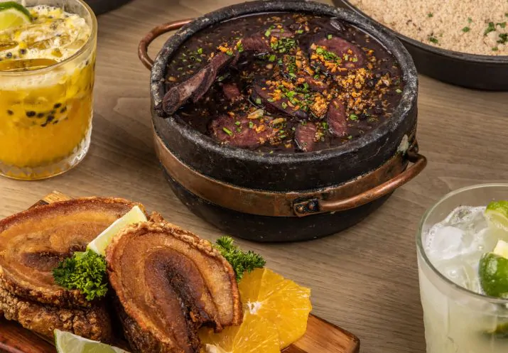 Feijoada completa com buffet de entradas, principais e sobremesas, além de open bar com cerveja Cacilds, caipirinhas e bebidas não alcoólicas.